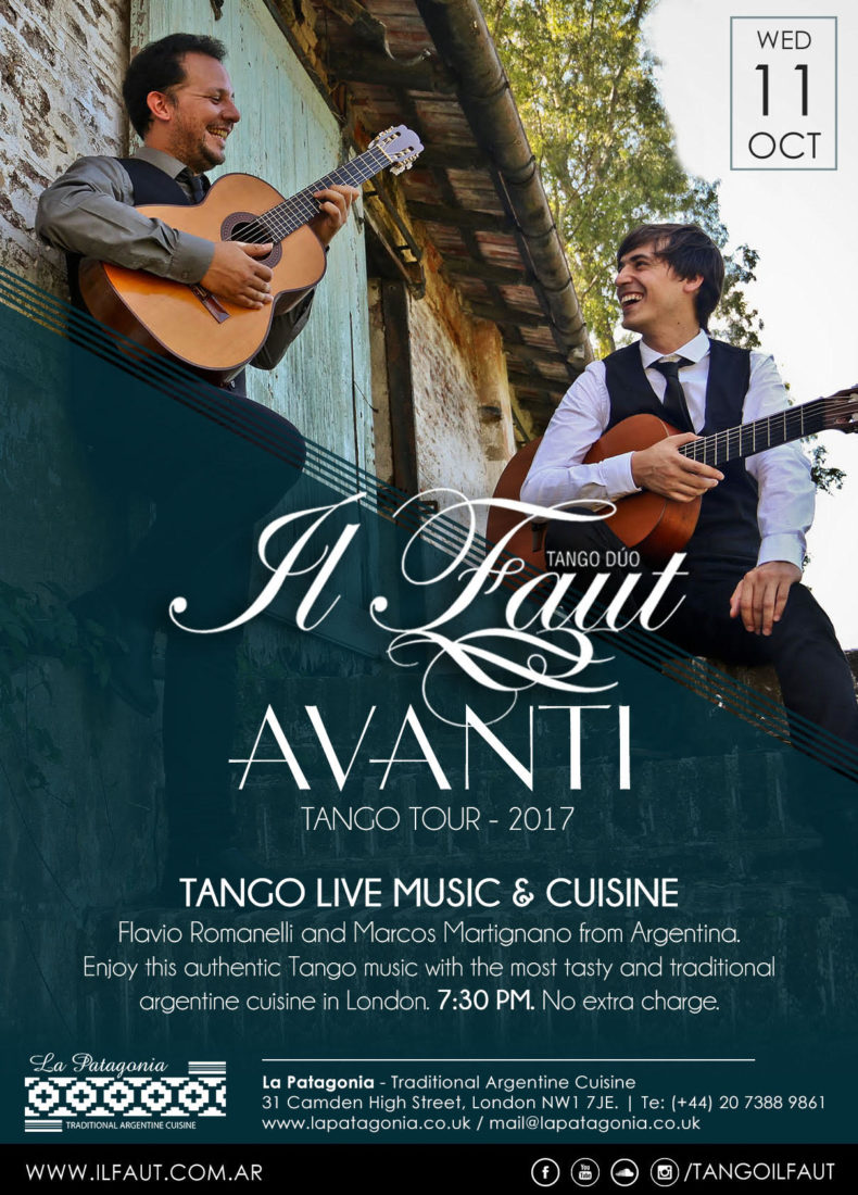 What's On 11th Oct – Tango Show Posted on 21 August 2017 By La Patagonia RestaurantComments Off on 11th Oct – Tango Show Il Faut Tango DĂșo – Avanti Tango Tour 2017 – Authentic Tango Music with Flavio Romanelli and Marcos Martignano.