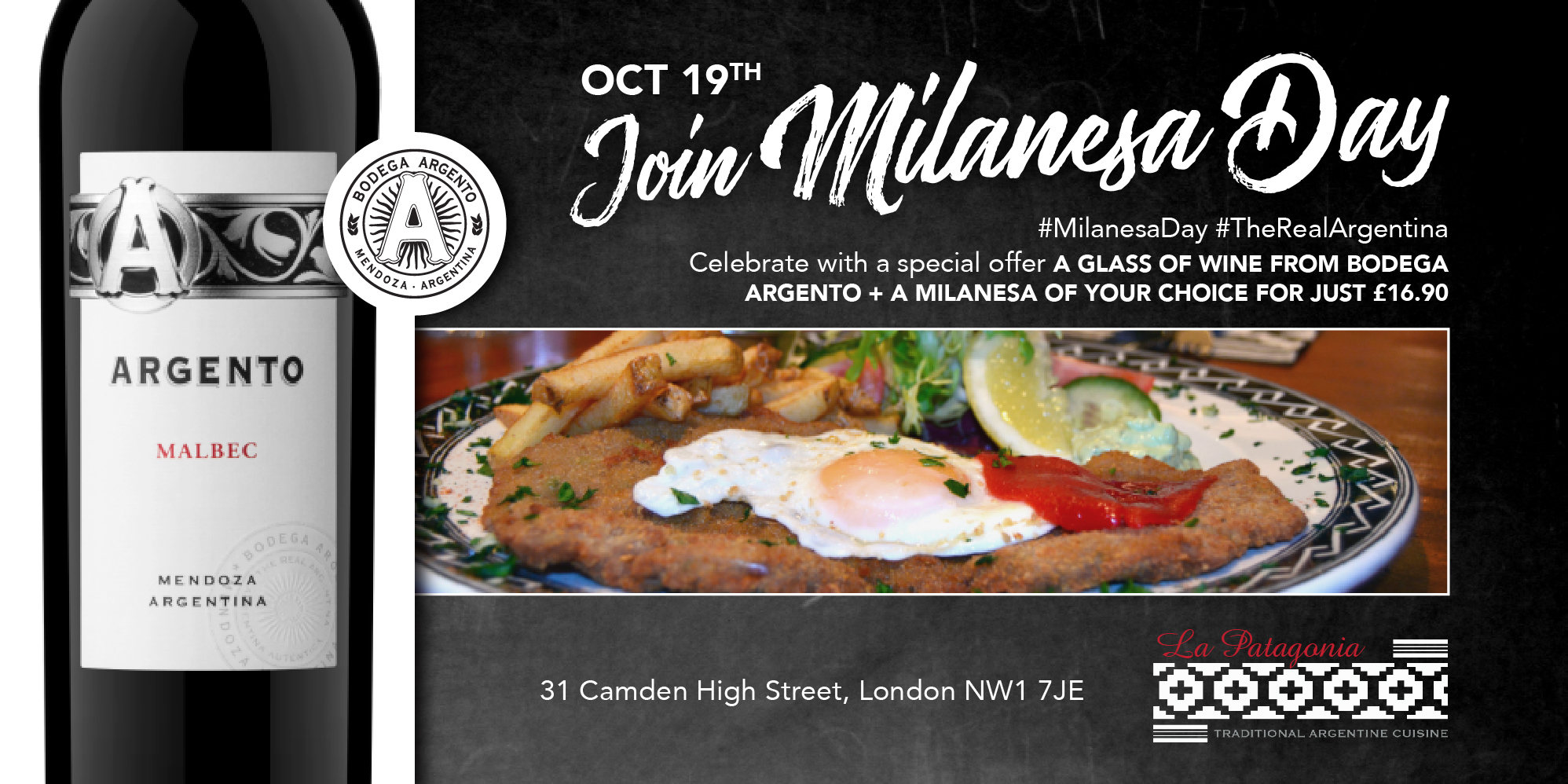 October 19th #MilanesaDay #TheRealArgentina We invite you to celebrate the Milanesa Day with this special offer: a glass of wine from Bodega Argento + a milanesa of your choice for just£16.90. Book your table here